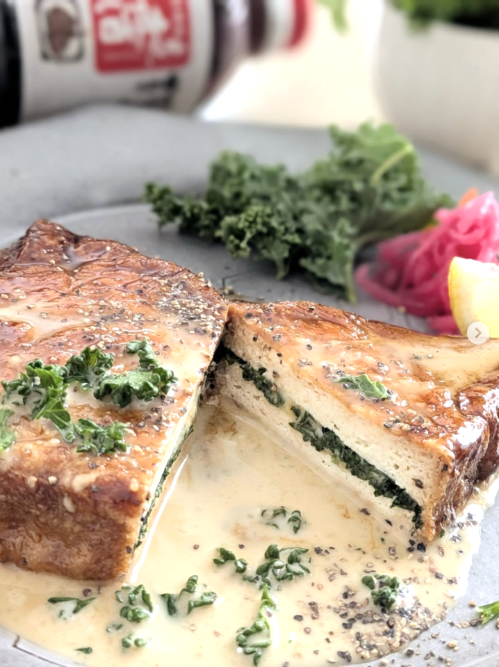 - お皿に付け合わせ野菜を盛り、ソースを広げ、焼けた厚揚げをおき、粗挽き黒胡椒、パセリを添える。